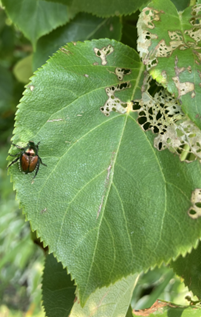 Japanese beetles. The Japanese beetle is about ½” (13 mm) long. It has metallic green- and bronze-coloured wings. Tufts of white hair are visible around its abdomen. The larva overwinters in the soil; the adult emerges from mid-June to September. The adult skeletonizes soybean leaves, eating tissue between veins. You need 25% defoliation from insects to warrant control. This is a picture of a Japanese beetle eating a shrub.