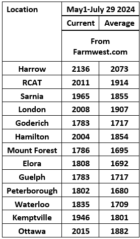 Crop conditions Weather This week last year we were significantly behind an average year. And we were wet. This year is not as bad for most of the province. Some areas have unseeded acres and we feel for those farmers. The weather below shows we are on average about 4 days ahead of long term CHUs. We are averaging about 25 CHUs per day. Winter wheat harvest is still ongoing in central Ontario and Grey, Bruce, and Simcoe. Corn 60-70% of the crop planted by May 20-24th crop is tasseling. Most of the rest of those planting dates will tassel by end of the week. I like to see corn tassel by August 1st. Last year about 40-60% of the corn was in tassel by August 1st so we are a bit ahead of last year.