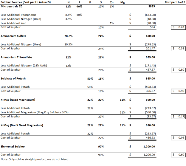 50 lbs actual S/ac of Elemental sulphur is almost the same price or possibly even more expensive than using 20 lbs actual S /ac of Sulphate sulphur in the spring. I find elemental sources too slow to become available in my mixed stands in cooler soil conditions, and as a result do not recommend them. Even using Ammonium Thiosulphate in winter wheat nitrogen applications will show up as sulphur deficient in my area until we have warmer weather conditions due to the slower release of that form of S. My clients that apply summer and fall dairy manure (which would contain sulphur in the elemental form @ 5-10 lbs/1000 IMP gallons), comment that they see a response to spring applying blends containing ammonium sulphate.