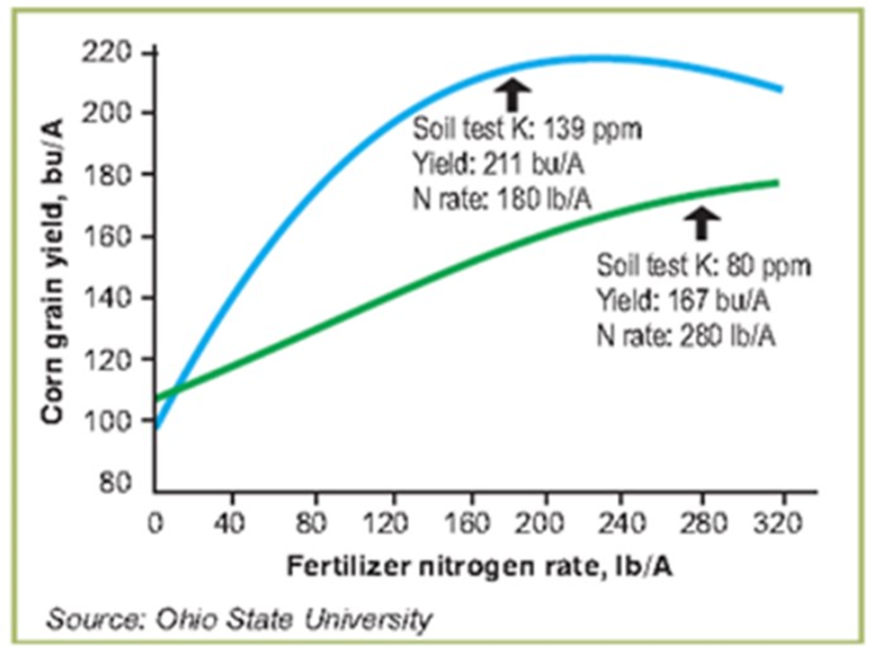 Answer – If you have low potassium soil, fix it. Potassium helps to improve nitrogen efficiency in the plant. Even if you do not have low potassium soils, there is local research to suggest applying nitrogen in excessive amounts at once (C. Brown – OMAFRA) can inhibit potassium uptake, causing a yield reduction. Balanced crop fertility makes better use of nutrients and provides more yield response than just applying increasing higher N rates.