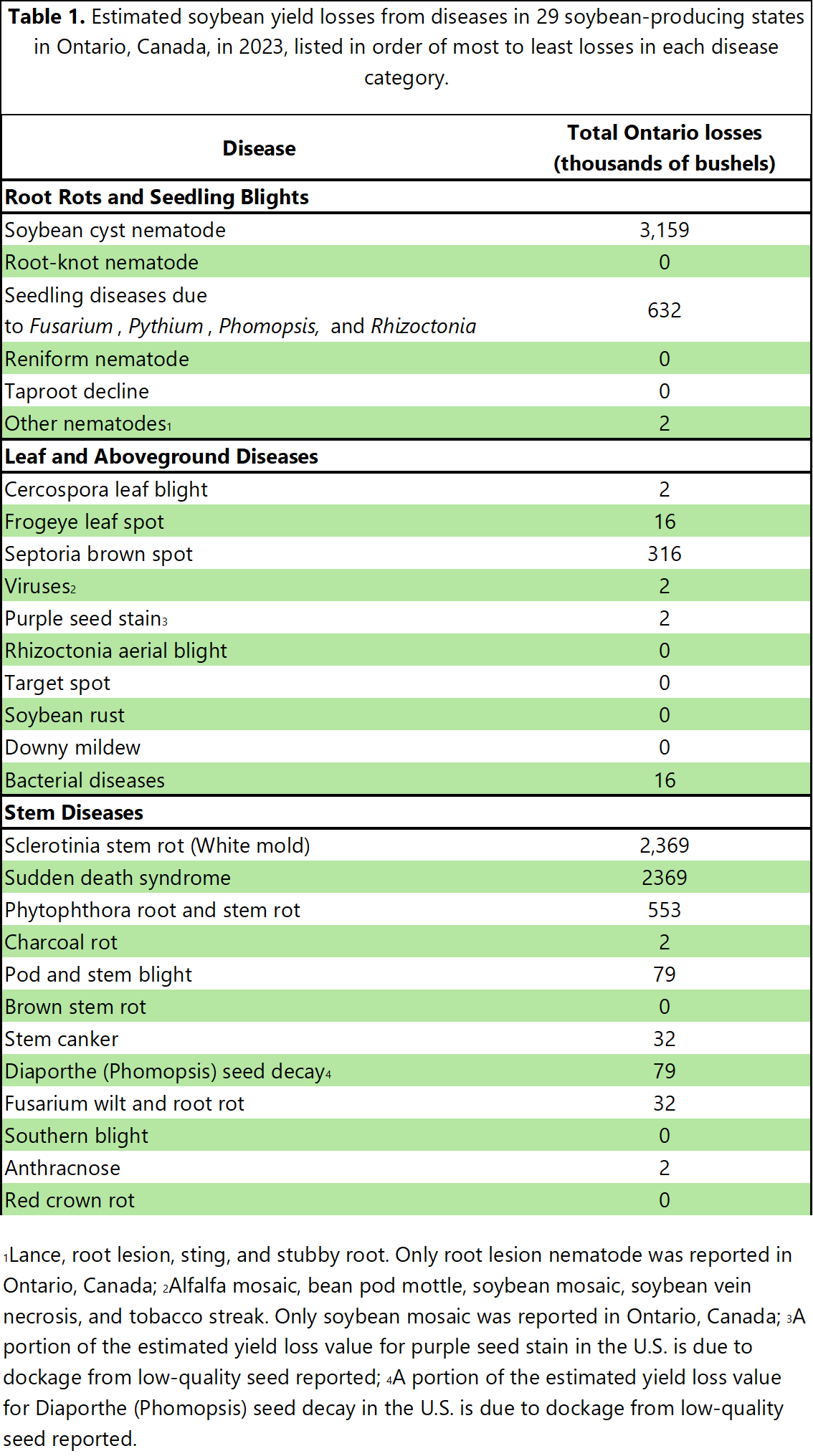 In all, an estimate of 4.8 percent of the potential soybean production (bushels/acre) in 2023 was lost due to disease from the 29 soybean-producing U.S. states, and 6.1 percent of the total soybean bushels in 2023 were estimated to be lost due to disease in Ontario, Canada. Table 1 provides yield loss estimates for the specific diseases throughout the soybean production system in the U.S. and Ontario, Canada, and Figure 3 compares the proportion of losses caused by major diseases. The 2023 estimated losses from soybean disease in the U.S. are the second lowest observed out of 28 years of available data, with only 2022 being lower. In Ontario, 2023 percent losses were slightly higher than in 2022, reversing an annual decline beginning after 2018.