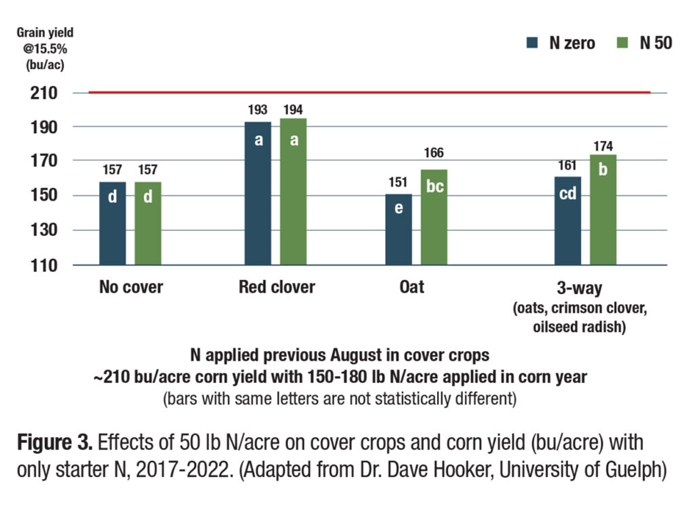 Red clover provides a reliable N supply to corn, but non-legume cover crops don’t because they don’t release N in sync with corn’s demand. Applying manure can result in slightly earlier and potentially higher – N release from cover crops, closing the gap in N supply and demand. For the past five seasons, Dr. Dave Hooker at the University of Guelph has evaluated how corn yield is affected by applying 50 lb N/acre in August to different cover crops. The only additional N was applied to corn as starter fertilizer on the planter in a 2”X 2” band (~30 lb N/acre). The combination of applying 50 lb N/acre to a cover crop (established the previous year) significantly increased corn yield compared to not planting a cover crop (Figure 3). Red clover is still the most valuable cover crop, but the combination of establishing another cover crop and applying 50 lb N/acre (from manure or a nitrogen fertilizer) is a good alternative for those that struggle to establish red clover.