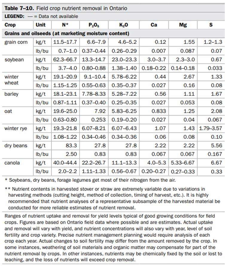 1. Crop Removal – take your yield by field or yield map and multiply it by the removal rate for phosphate or potash for the crop in question. See suggested OMAFA removal rates by crop below.