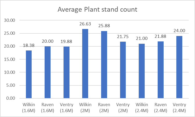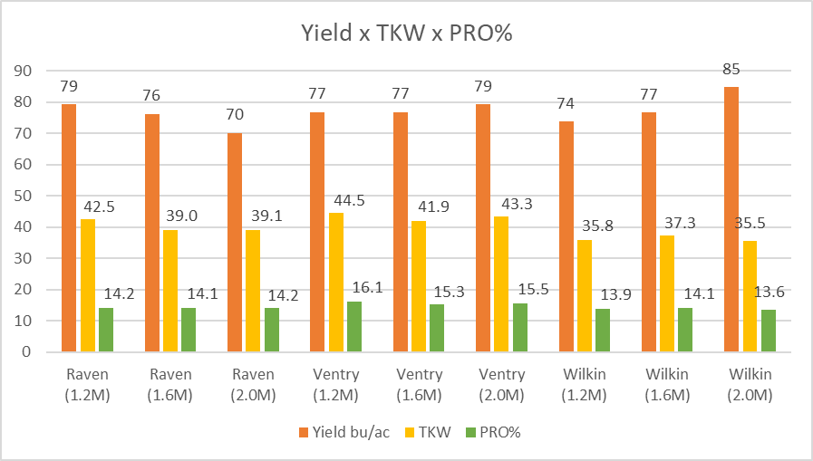 There did seem to be higher seed mortality at the higher populations, even though the plots were randomized. Some varieties respond better to increased seeding rates than others. Wilkin has very stable Thousand kernel rate regardless of seeding rate.