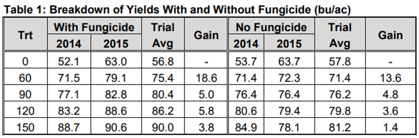 When it comes to helping customers figure out their nitrogen rate, my first comment is usually to ask what their fungicide use is and what variety are they growing. Increasing N rate without the use of fungicides will result in a lower yield response versus adding a 2-pass fungicide program. See WheatPete’s data below.